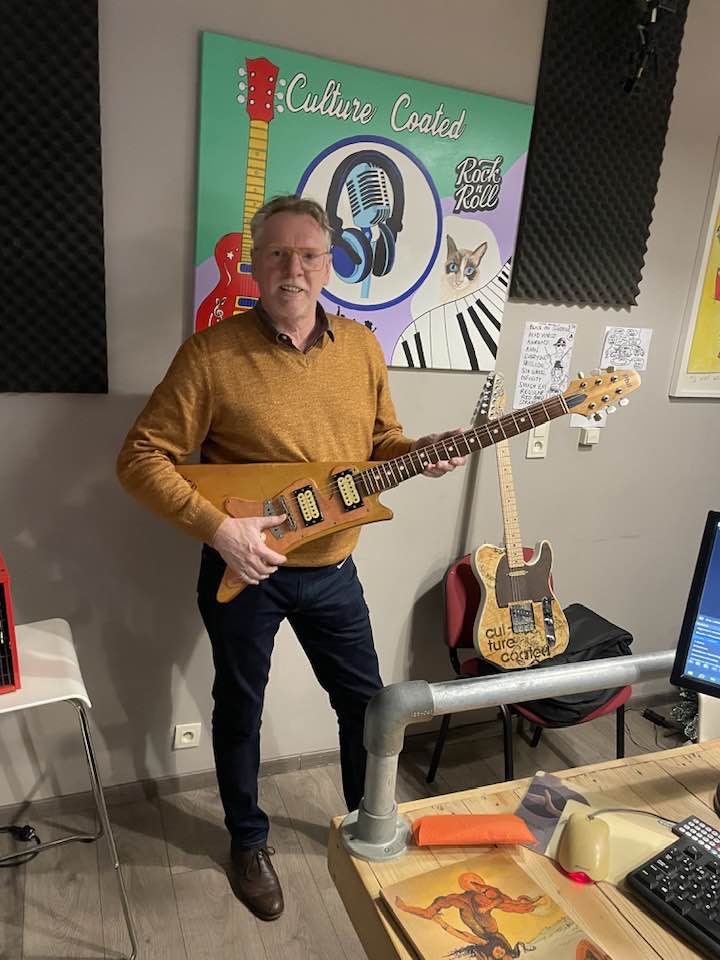Vanaf vrijdag om 11 uur is iedereen welkom in Casino Beringen. Op de foto staat Hans alvast paraat met de Phil-gitaar, geflankeerd door het werk van Leentje Verjans.